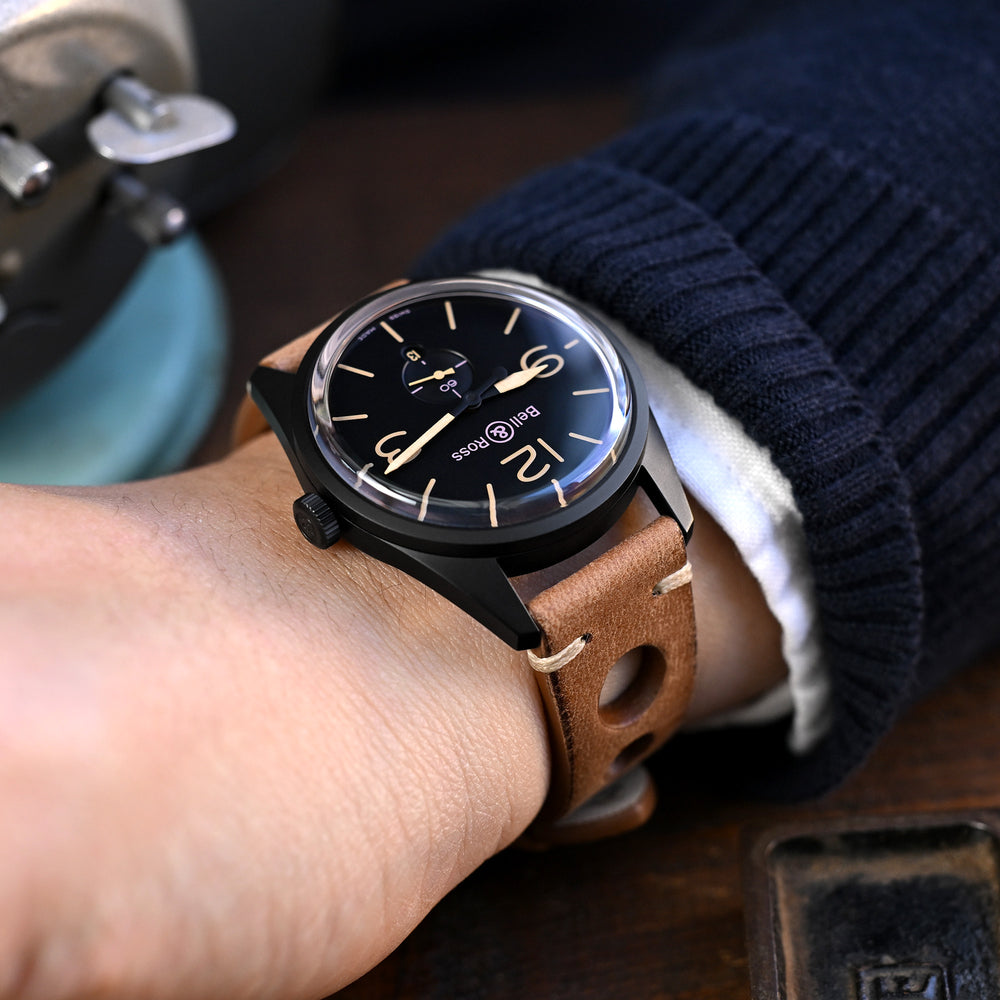 MiLTAT 22mm 意大利手工製作 棕色 大孔熱帶賽車 馬皮革錶帶 米色線