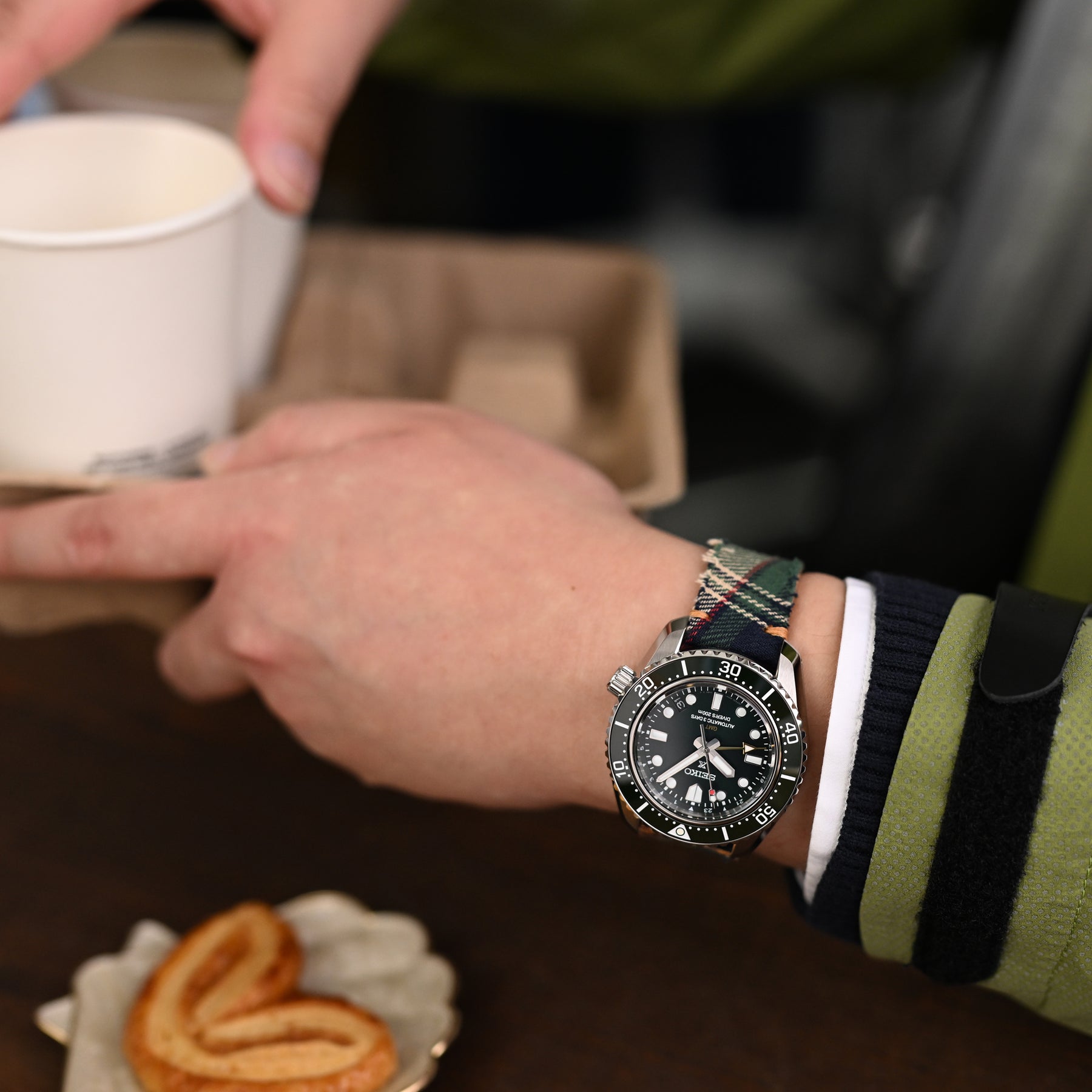 簡介: 蘇格蘭格紋圖案布,特徵是擁有多種顏色的交叉圖案與水平和垂直線條。這格子圖案布錶帶,切割後錶帶邊緣仍舊保留毛邊特色,加插在錶耳與尖端的小兩針手縫線設計,讓錶帶看起來更富有復古味道。考慮到提供穿著者更舒適的體驗,底層襯裡特別選用意大利植鞣皮,落實高質量錶帶貫徹始終的設計。