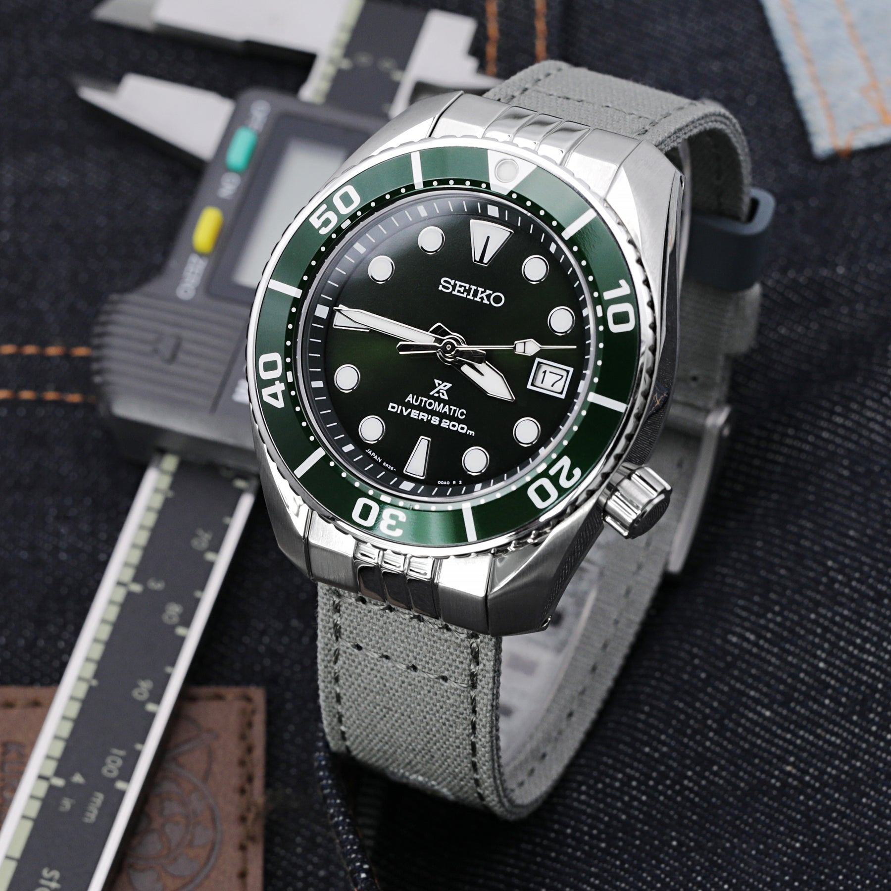 升級無縫 精工Sumo 小MM彎曲鋼粒尾端附件 雙層帆布錶帶卡其綠色 快拆錶帶